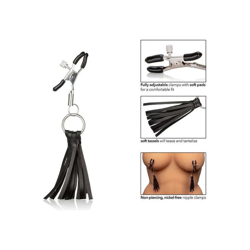 Die verstellbaren Klemmen mit weichen PVC-Pads sorgen für sicheren Halt und angenehmen Tragekomfort, während du die Intensität individuell dosieren kannst. Das Beste: Die weichen, veganen Tasseln kitzeln verführerisch bei jeder Bewegung – für optische Highlights und sensorische Reize in einem.