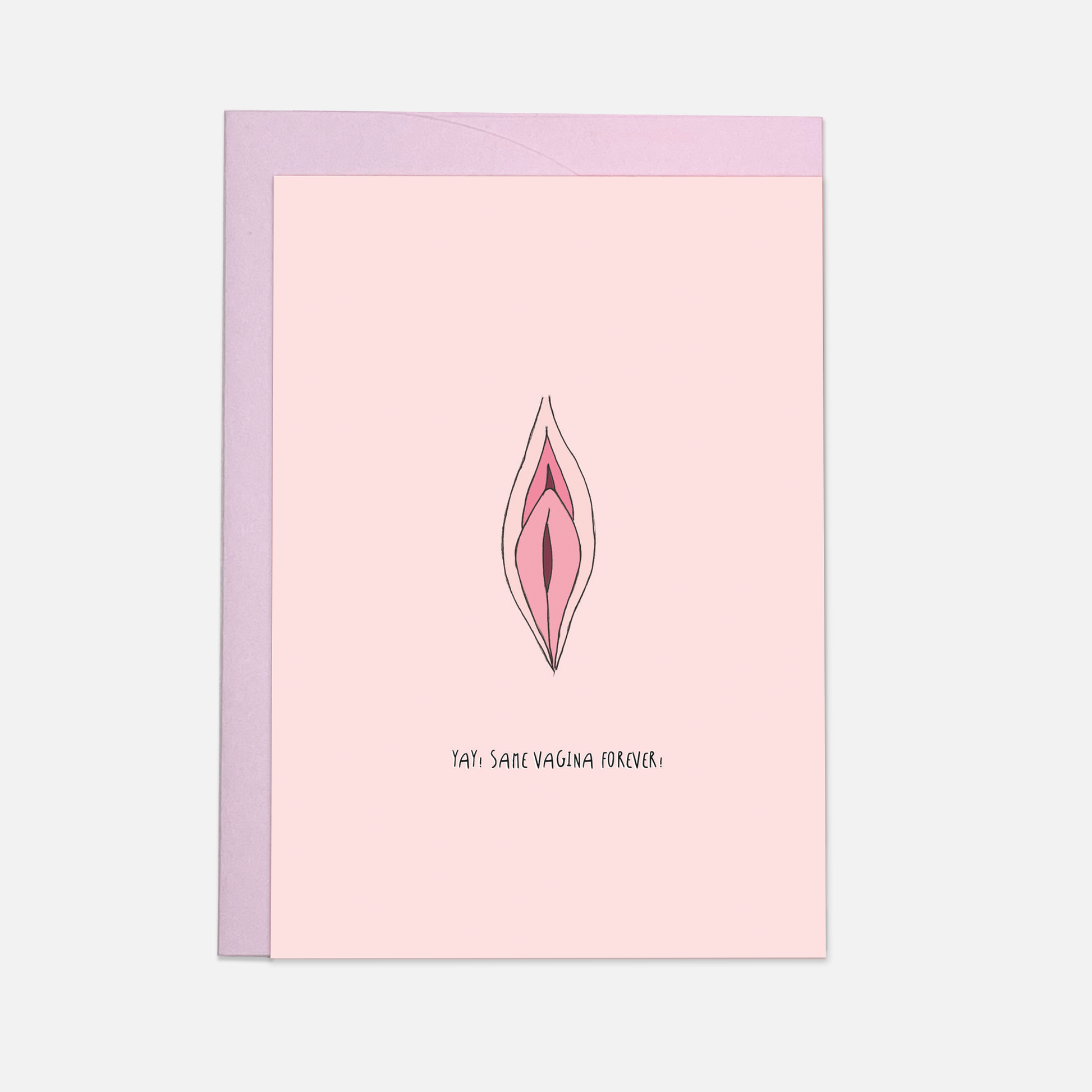 Schicken Sie Ihren Freunden, die kurz vor der Hochzeit stehen, eine originelle Grußkarte und überraschen Sie jemanden mit dieser Karte „Same Vagina forever“.